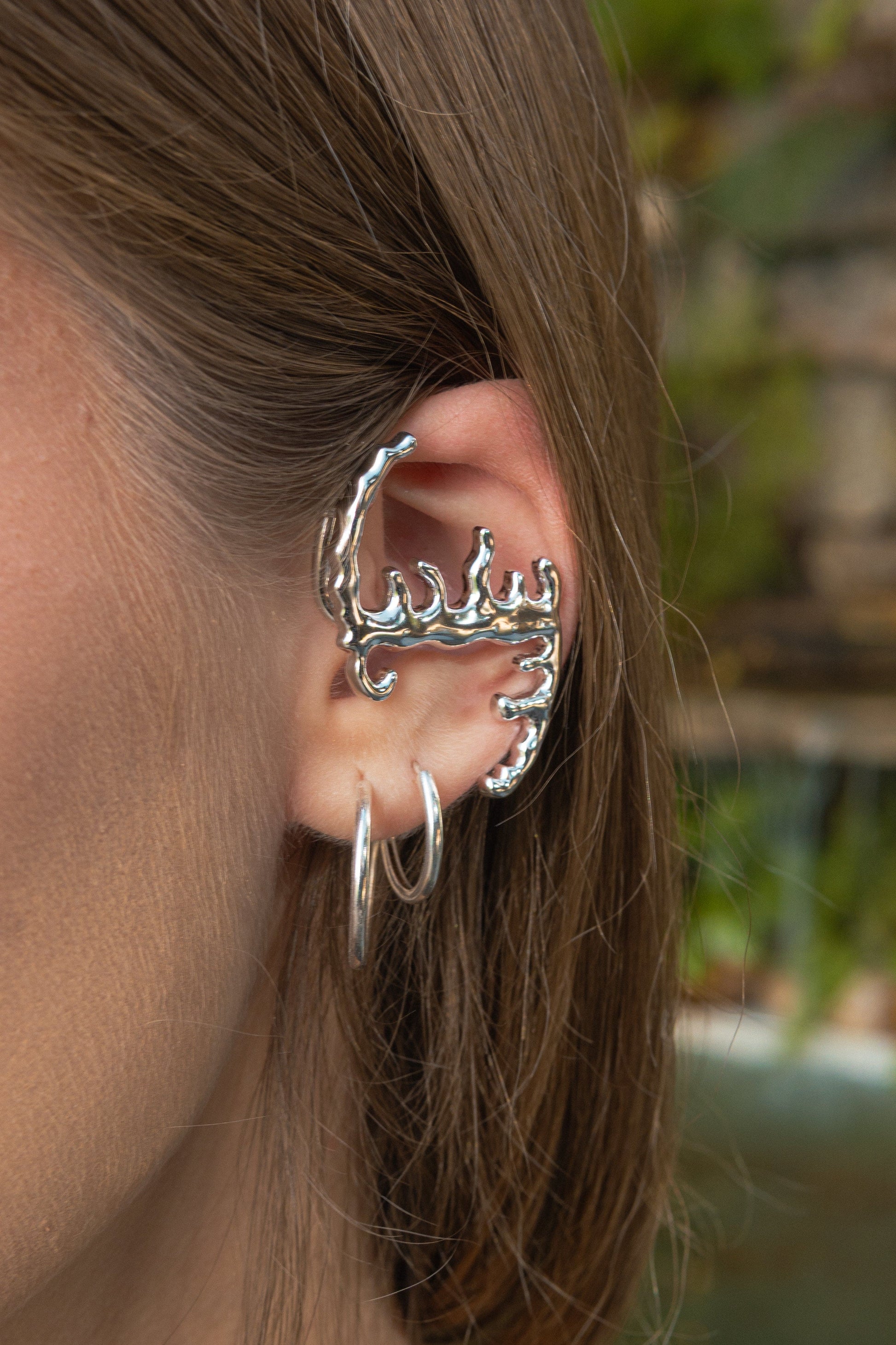 The Flammes Earrings were designed to follow the natural curves of the ear, fitting precisely along the upper and lower outer edges near the lobe. The visual effect is striking, as if small flames were contouring your ear, adding intensity and style to your look.